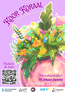 Op zaterdag 21 maart verrast koor Koraal uit Elburg de Theodorakapel in Zwolle. We brengen een gevarieerd programma met een greep uit ons eigen repertoire. Het nationale